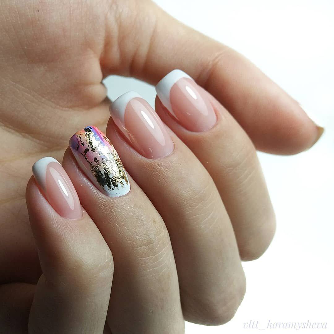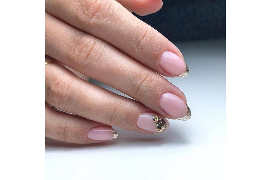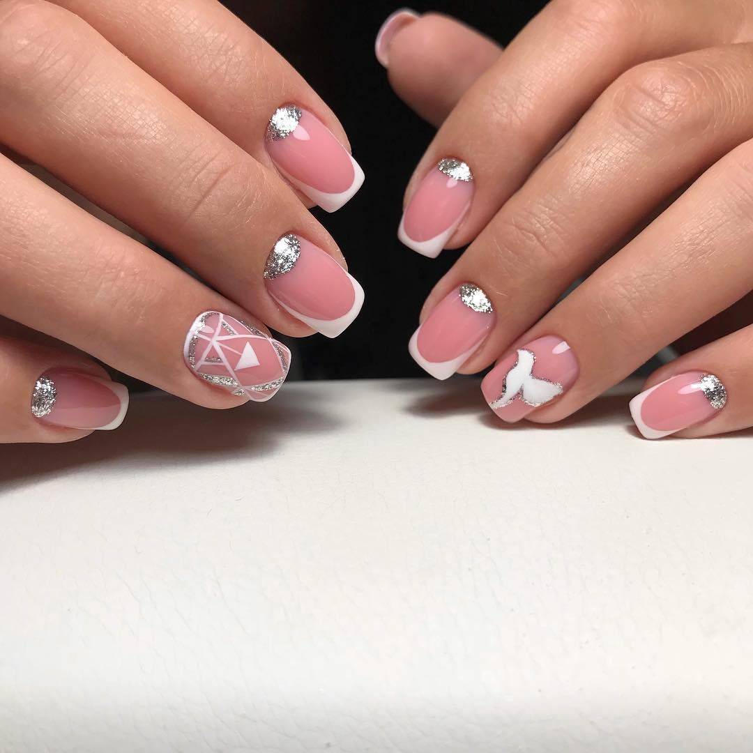 Актуален маникюр, когда блестки расположены плотным слоем по линии френча, а ноготок безымянного пальца покрывается полностью. В тренде оттенки шиммера – золотой, жемчужный, фиолетовый, медный, разноцветный.