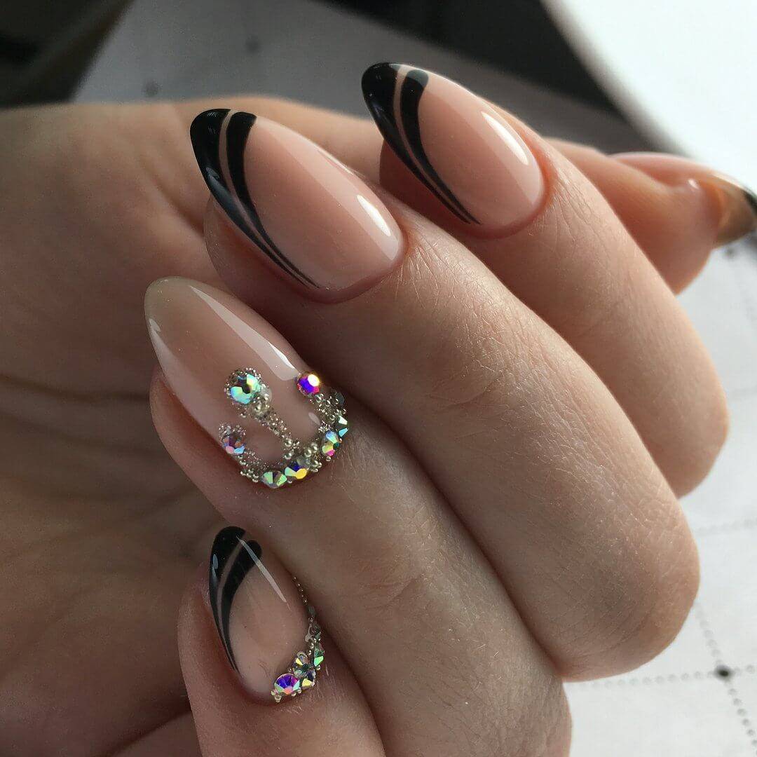 Неординарно будет смотреться черный френч с блестками по контуру улыбки. Такой маникюр может быть исполнен с яркой или нейтральной базой. Прорисовывается улыбка косой конфигурации или внахлест.