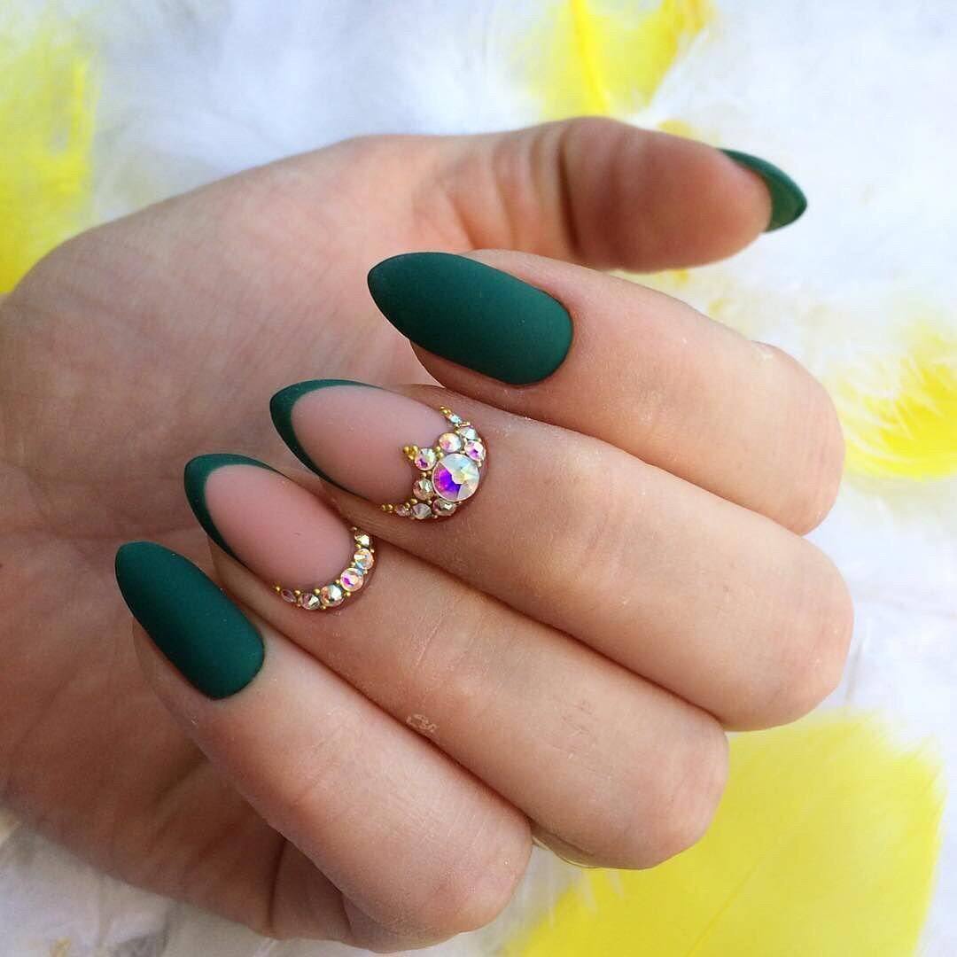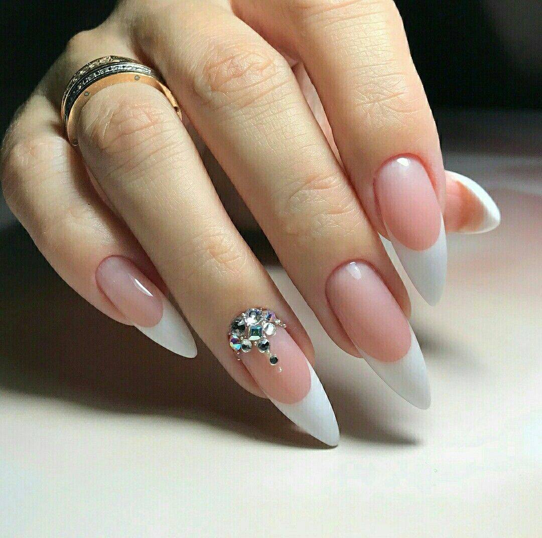 - Острые или миндалевидные ногти. При острой форме края ногтя, даже недостаток длины не является противопоказанием к френчу. Главное, не используйте светлые оттенки, они визуально «съедают» базовый шеллак и выглядят неопрятно.