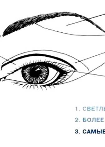 Зона под бровью и внутренний уголок глаза закрываются светлым цветом. А складка века от середины – самым тёмным