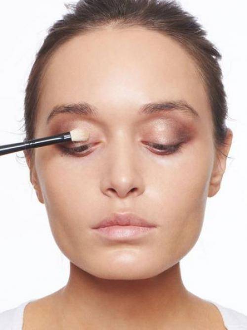 - При помощи плоской кисточки на все верхнее подвижное веко наносятся тени естественной гаммы (как правило, колер должен быть близок к тону кожи). Так кожа век будет казаться идеально ровной.