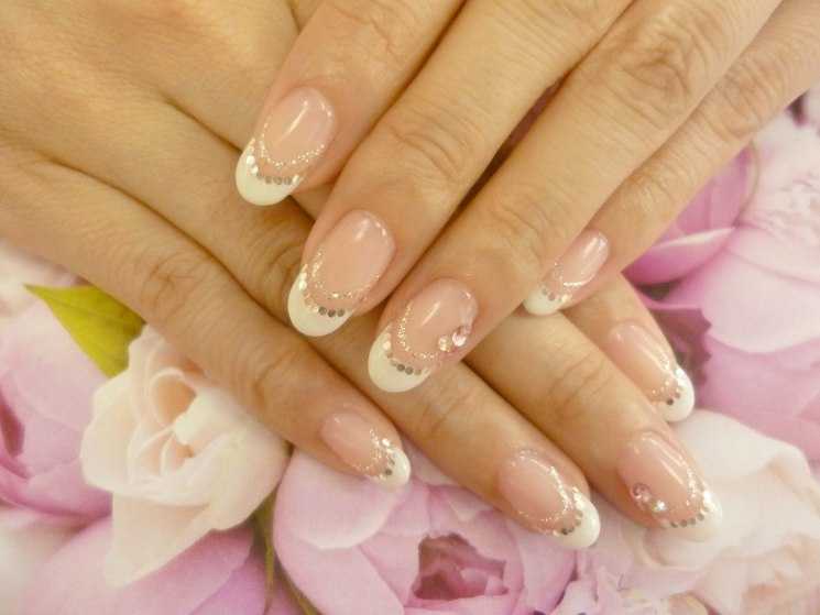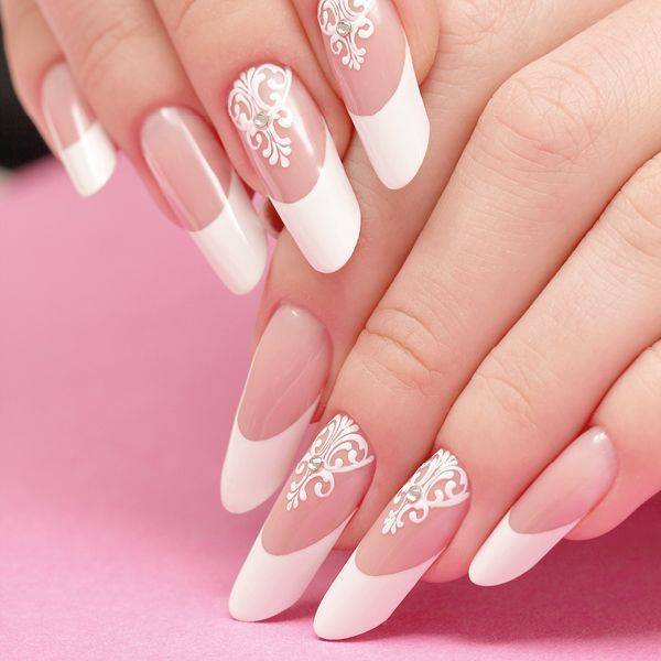 Французский маникюр с кружевом выглядит очень нежно и романтично. Такой вариант подойдет как для романтического свидания, так и для свадебного образа.