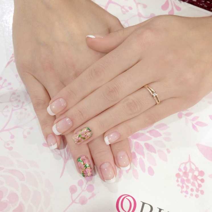 Французский маникюр наискосок дополнен нежным рисунком. Это придает образу оригинальности и изысканности.