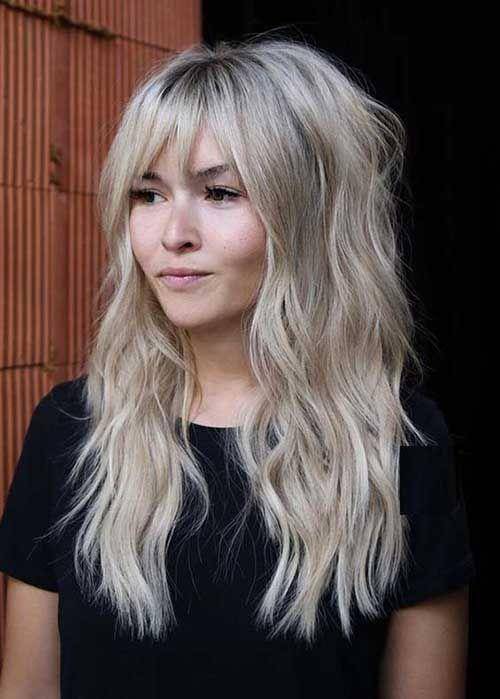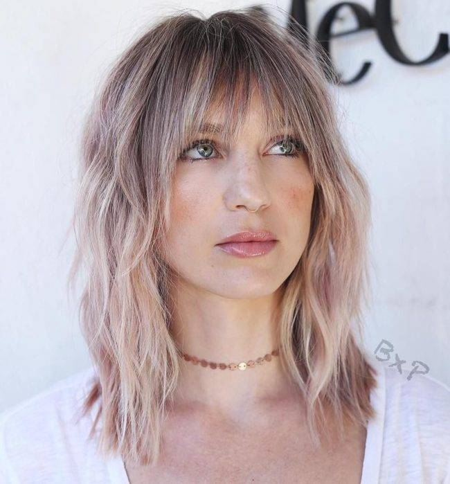 Женские стрижки на средние и длинные волосы с такой челкой смотрятся роскошно, особенно если добавить более модные цвета легкими бликами (шатуш, балаяж, воздушное прикосновение).
