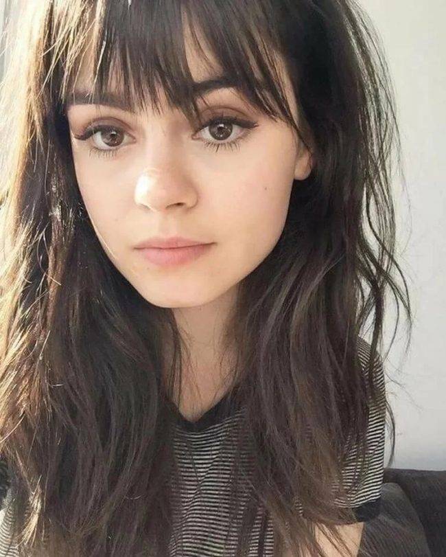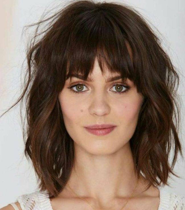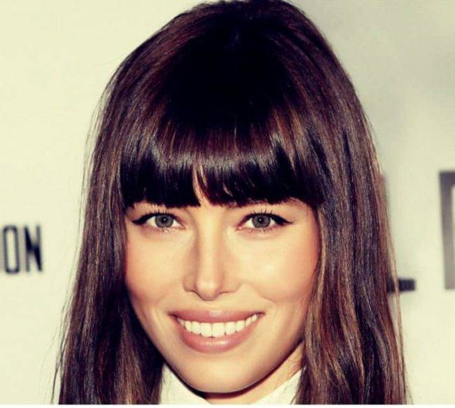 Она закроет слишком широкий лоб и отвлечет внимание от острого подбородка, таким образом, внеся гармонию. Такая челка делается негустой, чтобы придать легкость прическе