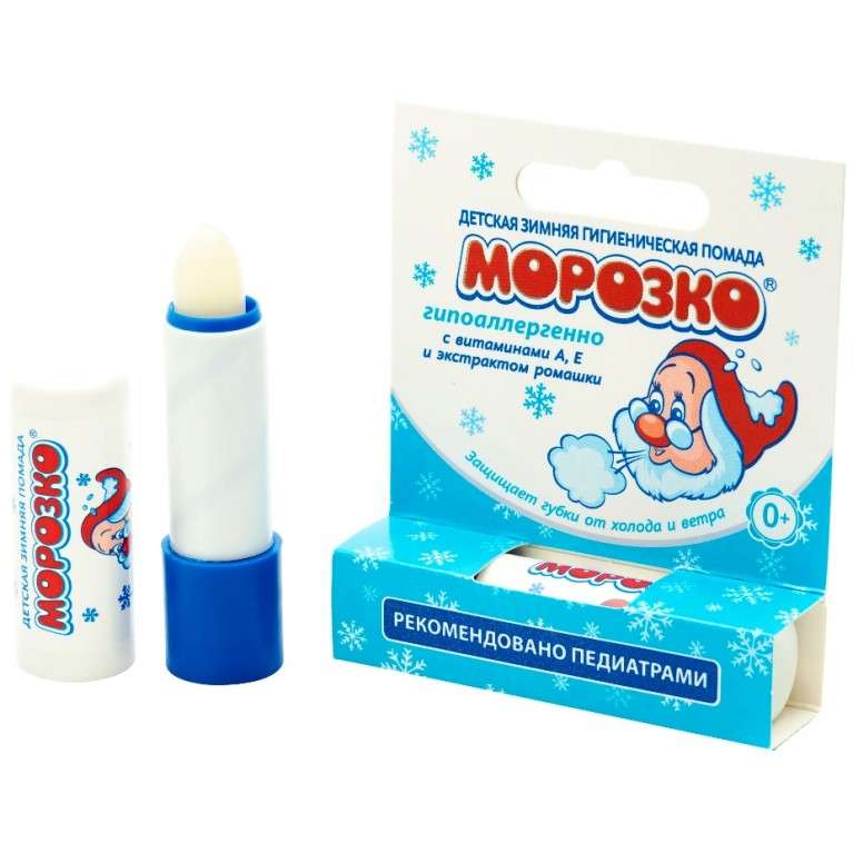 Гигиеническая помада Морозко защищает и ухаживает за кожей губ малыша в холодное время года. Содержит экстракт ромашки, комплекс целебных масел, витамины А, E. Предупреждает обветривание губ, появление трещинок и заед, способствует заживлению. Хорошо смягчает губы и придает им естественный блеск. Подходит для малышей с самого рождения. Удобный стик позволяет использовать его, когда нужно, будь это палящее солнце или прохладные ветреные дни. Увлажнение, комфорт и здоровье губ – отличный результат. Гипоаллергенный состав гарантирует безопасность применения данной продукции.