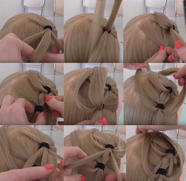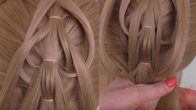 - Верхнюю прядь разделить на две части. На нижней приспустить резинку и сформировать отверстие посредине. Продеть в него две прядки с верхней части и вывернуть их наружу.