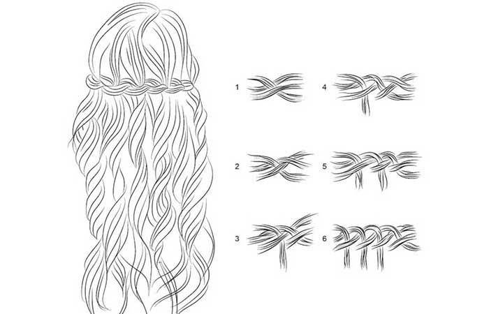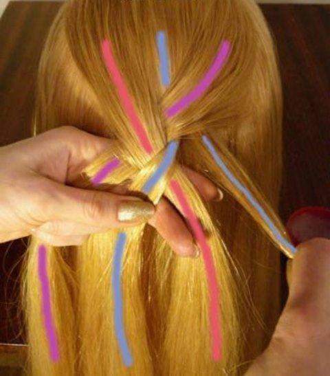 Левая часть волос перекидывают на центральную прядь, должен получиться крест. Под участок волос, который по центру, продевается прядь с другой стороны. Дальше необходимо совершить идентичные действия со стороны в сторону, более подробно показано на схеме плетения.