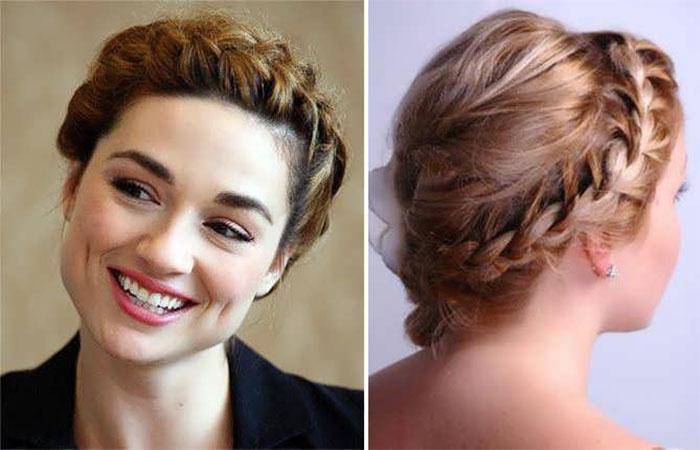 В области уха выделить три тонкие секции и приступить к созданию обычной косы. Сделав несколько витков, добавлять новые локоны, расположенные в области лба. Вовлекать в процесс волосы от макушки нельзя. Продолжить плетение, направляясь от одного уха к другому. Полученный элемент соединить с остальными волосами и создать хвост. Можно оставить в таком виде или закрутить волосы в пучок.