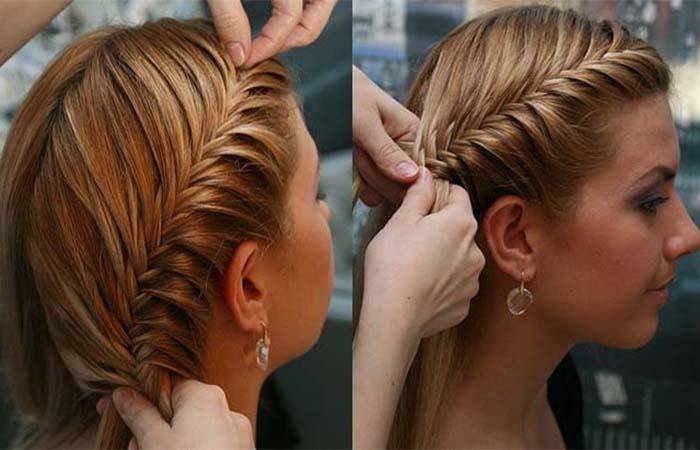 Если хочется простую, но стильную причёску, то стоит обязательно обратить внимание на «рыбий хвост». Первоначально необходимо сделать низкий хвост и поделить волосы на две равные части. Тонкими прядями нужно перекидывать волосы в середину, оставляя остальные волосы