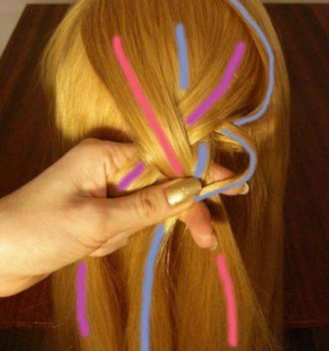 2. На макушке возьмите три тонкие прядки. Для удобства каждая из них окрашена другим цветом.
