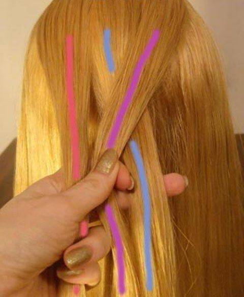 - Правой рукой просовываем первую прядь под вторую. Левой рукой накладываем третью прядь поверх первой.