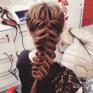 Если хочется простую, но стильную причёску, то стоит обязательно обратить внимание на «рыбий хвост». Первоначально необходимо сделать низкий хвост и поделить волосы на две равные части. Тонкими прядями нужно перекидывать волосы в середину, оставляя остальные волосы