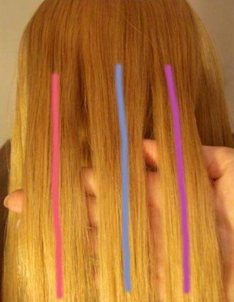 2. На макушке возьмите три тонкие прядки. Для удобства каждая из них окрашена другим цветом.