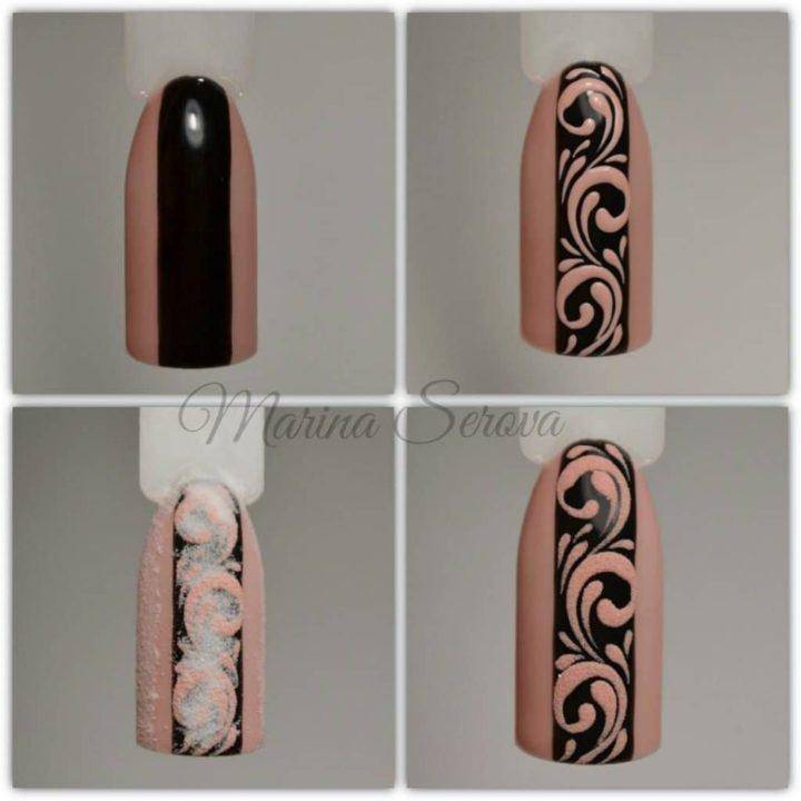 Процесс создания бархатных узоров немного отличается от полного покрытия ногтевой пластины. Конечно же, перед этим маникюром следует подготовить ногти, как и перед любым другим, и покрыть их основой. И только после этих процедур можно приступить к созданию желаемого рисунка.