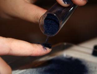 Бархатную или акриловую пудру экономить не надо. Ногтевую поверхность обильно посыпают. Для лучшей фиксации необходимо ее слегка прижимать.