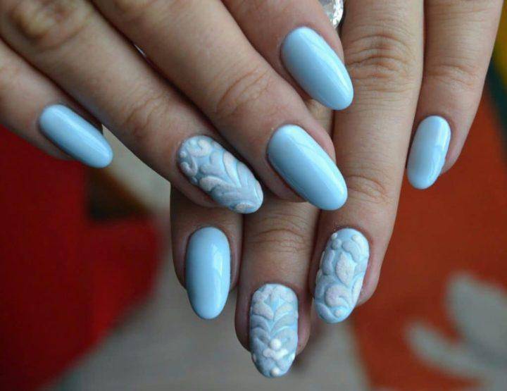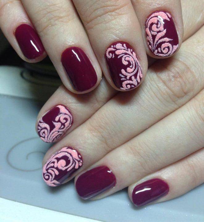 Еще одним вариантов маникюра с акриловой пудрой являются объемные вензеля. Такой маникюр выглядит очень эффектно. Причем пудра может быть любого оттенка, как дополняя, так и немного освежая маникюр.