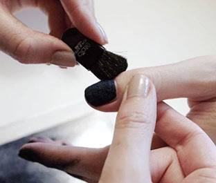 На еще не высохшую ногтевую поверхность надо насыпать много пудры, высушить и стряхнуть кисточкой остатки.