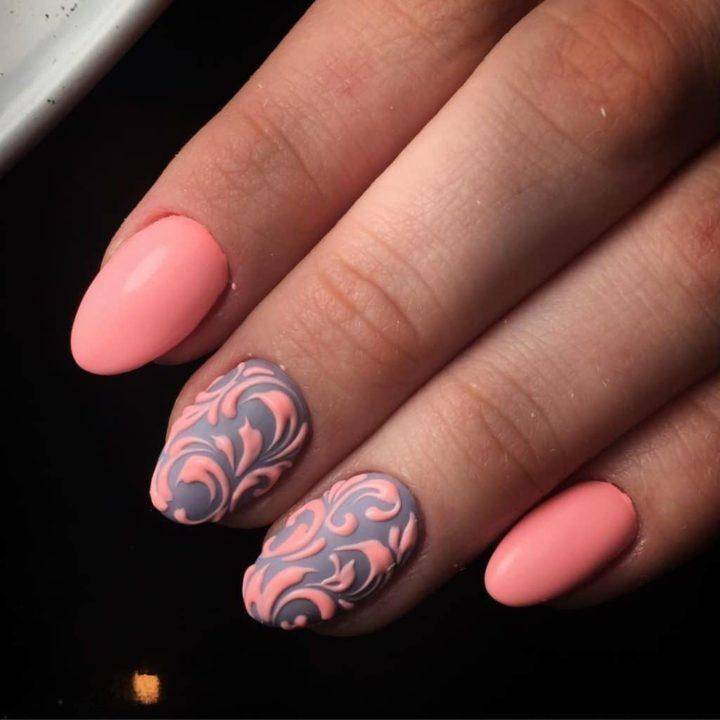 Матовые оттенки лаков обеспечивают хорошее крепление песка. На такой поверхности легко рисовать, изображение не растекается. При нанесении рисунка на весь ноготь возможно применение глянцевого лака.