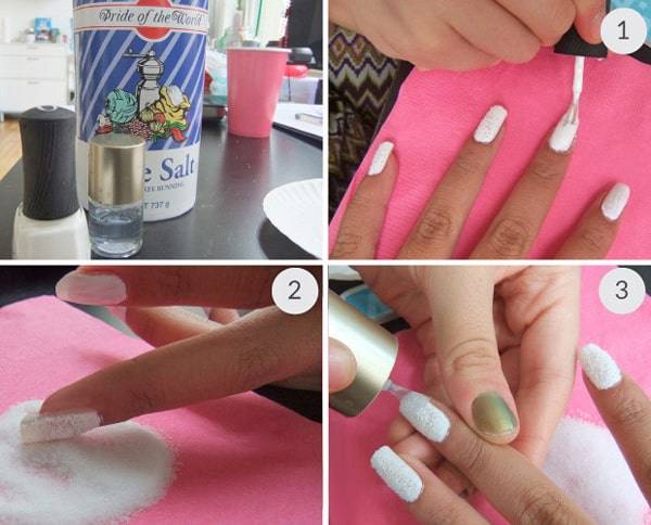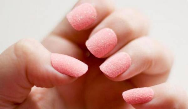 - Далее снова нанесите слой лака, и пока он не засох, обильно посыпьте его песком. Теперь нужно ждать. Главным минусом такого маникюра в домашних условиях является то, что сложно понять, ноготь высох или нет. Мы советуем ждать не менее 10 минут в теплой комнате и около 15 в прохладной;