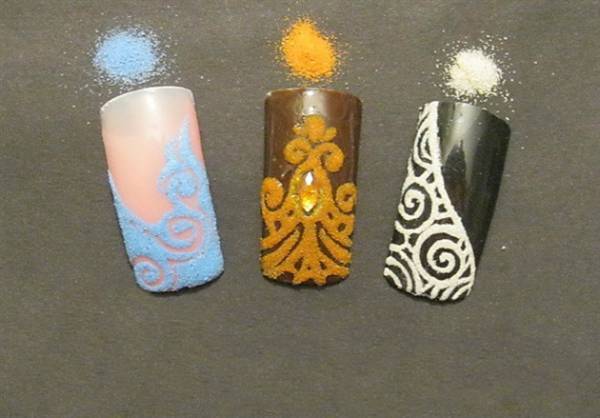 Очень красиво флок дополняет косички на ногтях, а блестящий песок — кружевные рисунки. Весьма необычно смотрятся на ногтях нарисованные и покрытые песком цветы.
