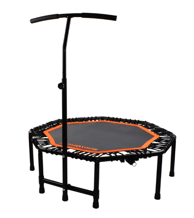 Батут для фитнеса или джампинга с ручкой бренда Body Form прекрасно справляется как с домашними, так и с профессиональными занятиями. Вдоль восьмиугольной рамы равномерно распределены 8 ножек. Оборудование имеет оптимальный диаметр полотна – 122 см. Складной каркас позволяет проводить занятия и хранить инвентарь даже в стесненных квадратных метрах. Комплектация предусматривает наличие шестигранного и разводного ключа для сборки конструкции. Для выполнения прыжкового полотна производитель выбрал сетку, способную выдержать до 120 кг.