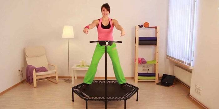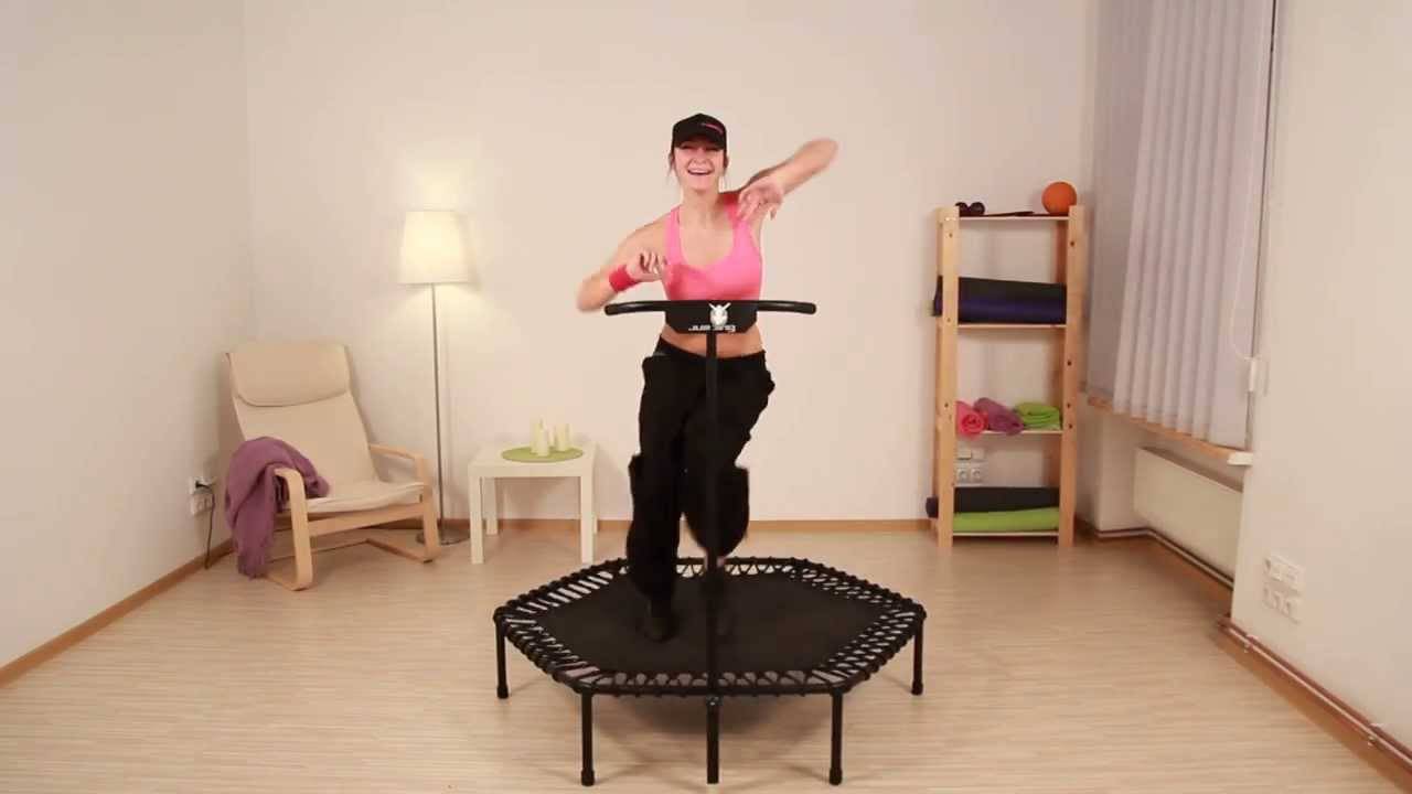 - Прыгайте на тренажере высоко вверх, повышая интенсивность. Для большего эффекта можно вытянуть руки перед собой и взять гантели.