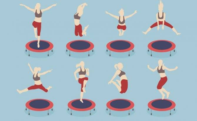 - начинать тренировку с подвижной разминки, ритмично подпрыгивая без отрыва носков от поверхности батута, а затем переходя к попеременному сгибанию ног и прыжкам;