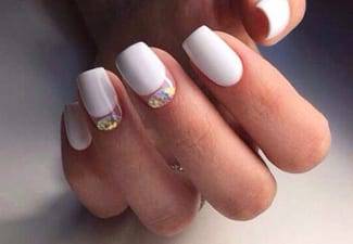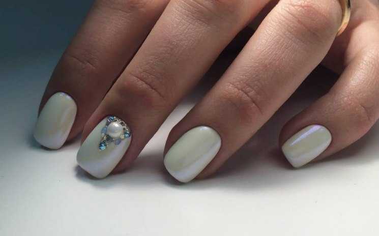 Если посмотреть на фото белого маникюра 2022 года, можно заметить, что все более популярным становится нейл-арт с втирками. Блеск, переливы, которые придает этот декоративный материал, эффектно смотрятся на белом фоне. В зависимости от основного тона втирки, получаются разные оттенки белого цвета с переливами, мерцанием.