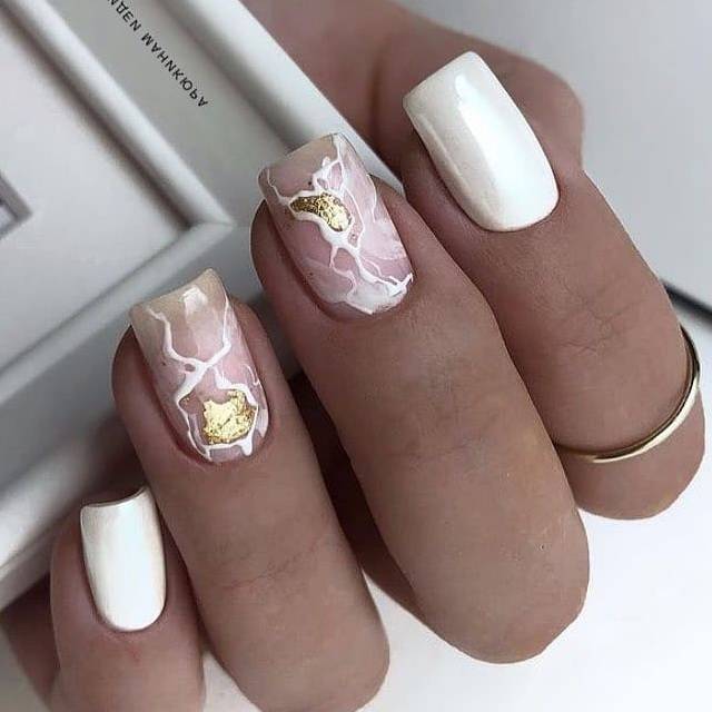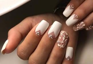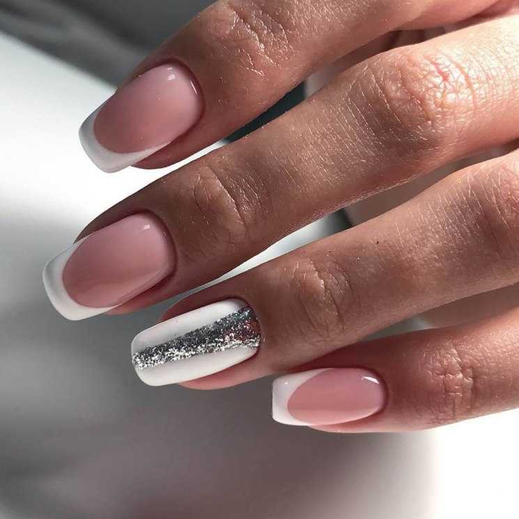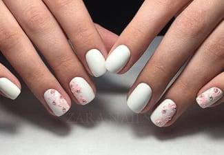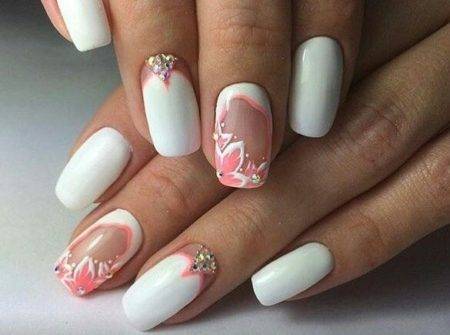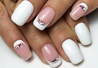 Все оттенки розового, а особенно пастельные гармонируют с белоснежным, создавая нежный, воздушный образ. Варианты белого маникюра на короткие ногти ниже на фото.