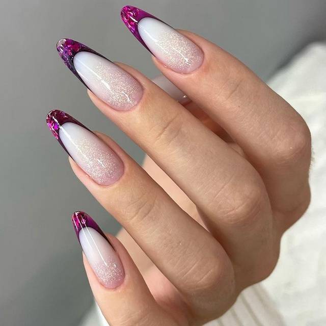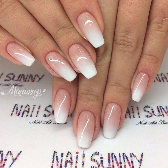 А если к дизайну на белых ногтях добавить блеска, будет лучший праздничный вариант. Цвет градиента может контрастировать с основным нарядом или быть в одной цветовой гамме.
