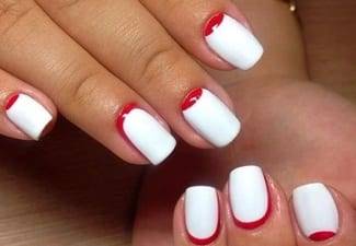 Вариант для дерзких. Подходит для длинных ногтей. Если у вас ультраострые ноготки — белый матовый маникюр с красным дополнением то, что нужно!