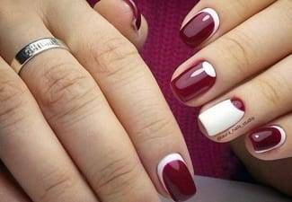 Все оттенки палитры бордо — глубокие, плотные и роскошные. В сочетании с белыми они смогут заиграть новыми красками. Можно добавить золото и серебро для роскоши. Это цветовое сочетание подойдет для коротких ноготков.