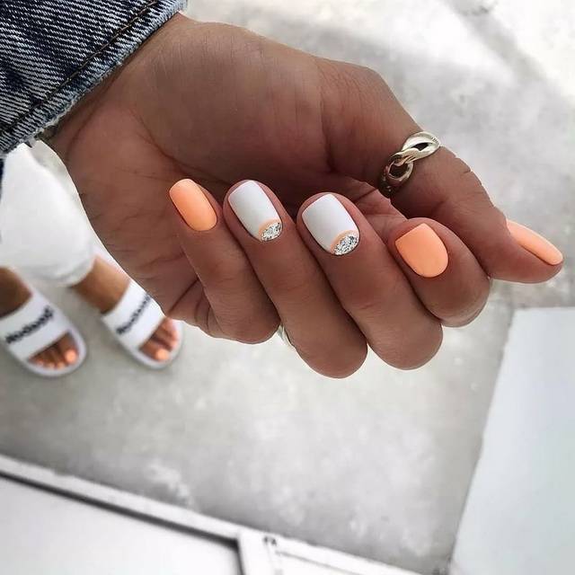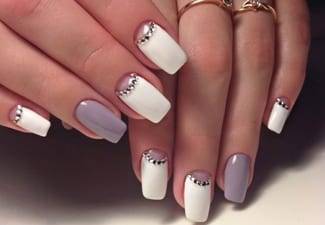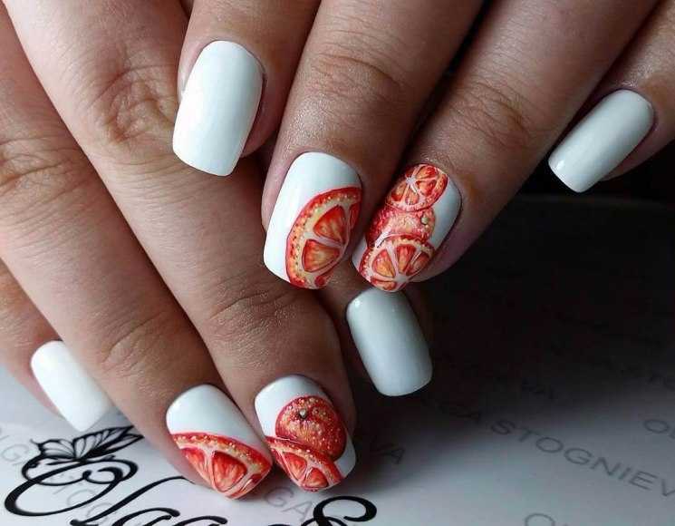 В тренде разноцветный маникюр, когда отдельные пальцы окрашивают белым лаком, а остальные — другими цветами. Дополняют композицию декором, росписью. Вариантов подобного маникюра множество, все зависит от концепции дизайна.