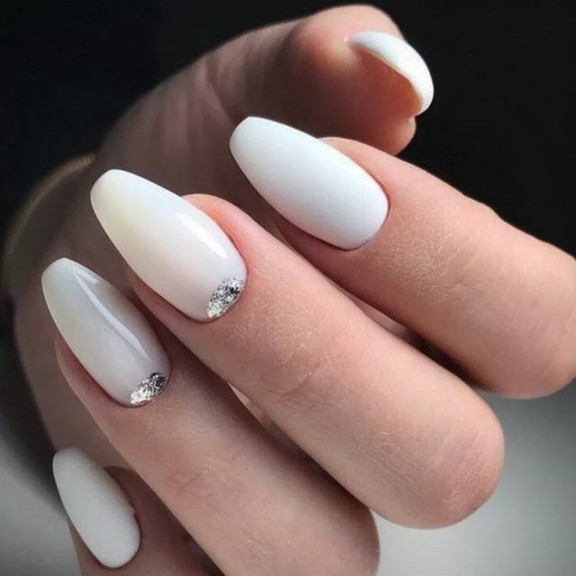 Спокойные тона — составляющие нюдового маникюра. Можно сделать глянцевый белый маникюр на длинные ногти, добавив матовый бежевый на пару ноготков.