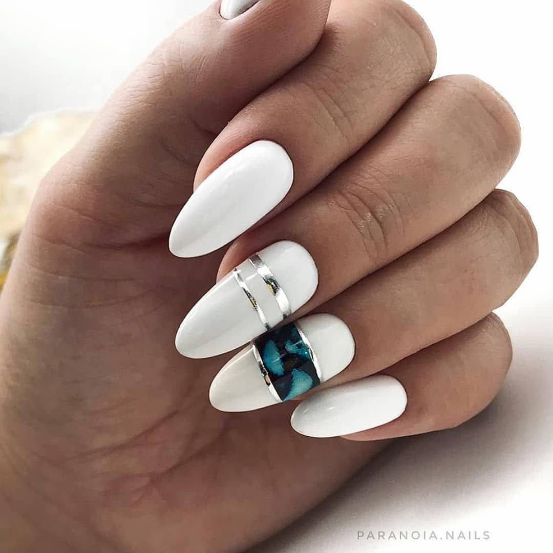 На страницах журналов с фото белого маникюра для 2022 году просматривается модная тенденция — обилие декора из фольги. Существует много видов фольгированного материала для нейл-арта. При помощи трафаретной фольги создают блестящие узоры на белом фоне. Используя другие виды, накладывают разные абстрактные принты с матовыми и глянцевыми текстурами.