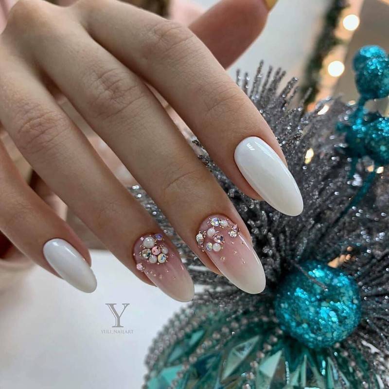 - композиция из стразов и бульонок – отлично смотрится на безымянном пальце, на остальных ногтях лучше выполнить однотонный светлый маникюр