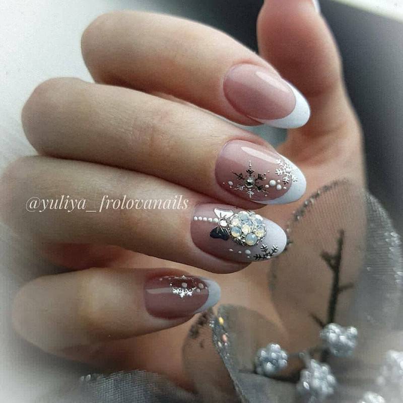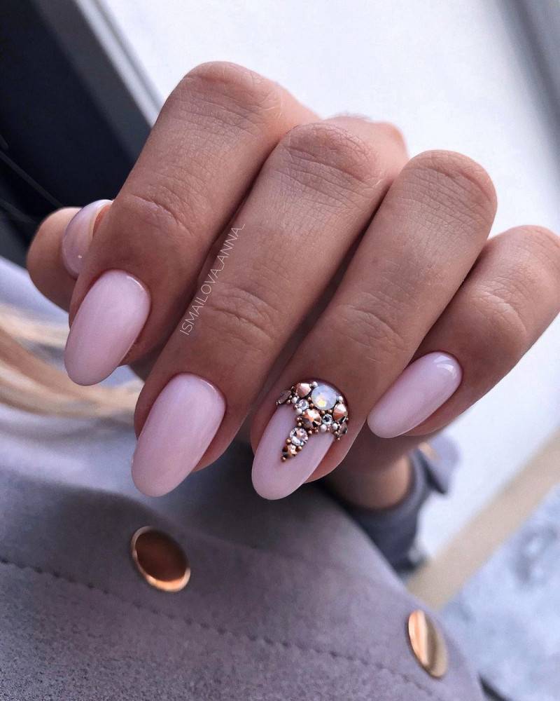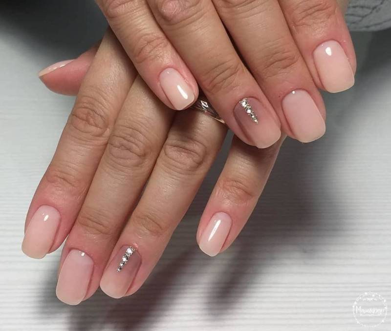 Куда же без этих украшений! С блесками и стразами бежевый маникюр смотрится ярко и эффектно. Но результат напрямую зависит от количества размещенных блесточек и страз. Чем больше их на ноготке, тем смелее можно утверждать, что маникюр претендует на звание праздничного.