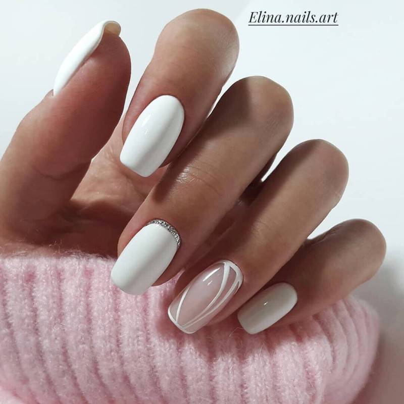 Любительницам лаконичного дизайна определенно придется по вкусу маникюр с “мазками кистью”. Это небольшие полоски, нанесенные на ногтевую пластину в другом цвете. Они прерывистые, что и делает их чуть более необычными. В сочетании с блестками такой маникюр выглядит свежо, стильно. При желании можно комбинировать данный рисунок с геометрическими или флористическими мотивами, паутинкой и другим декором. Это позволяет создавать большее количество рисунков на любой вкус.