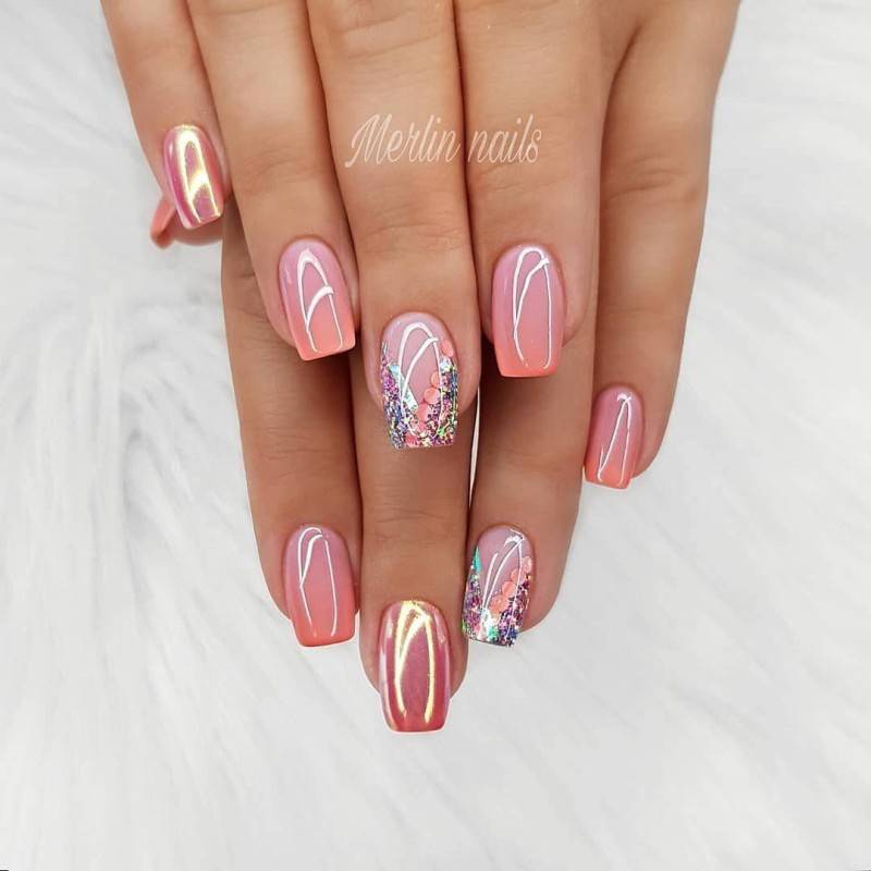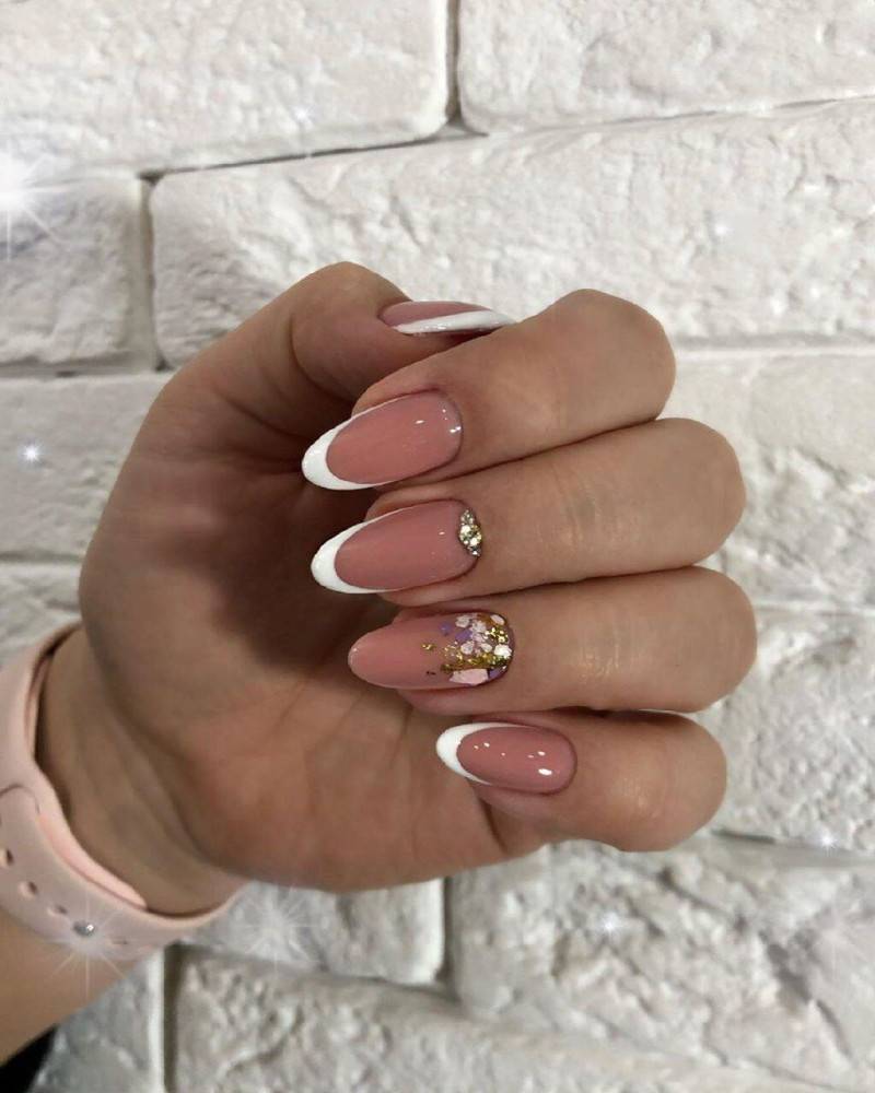 Бежевый и розовый смотрятся также нежно и воздушно, как и голубой маникюр. Сочетание бежевого и розового на первый взгляд кажется пустым и слишком светлым, поэтому многие нейл-мастера добавляют в дизайн блестящие детали в виде стразов, бульонок, глиттера, фольги.