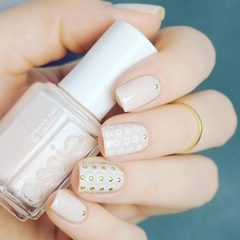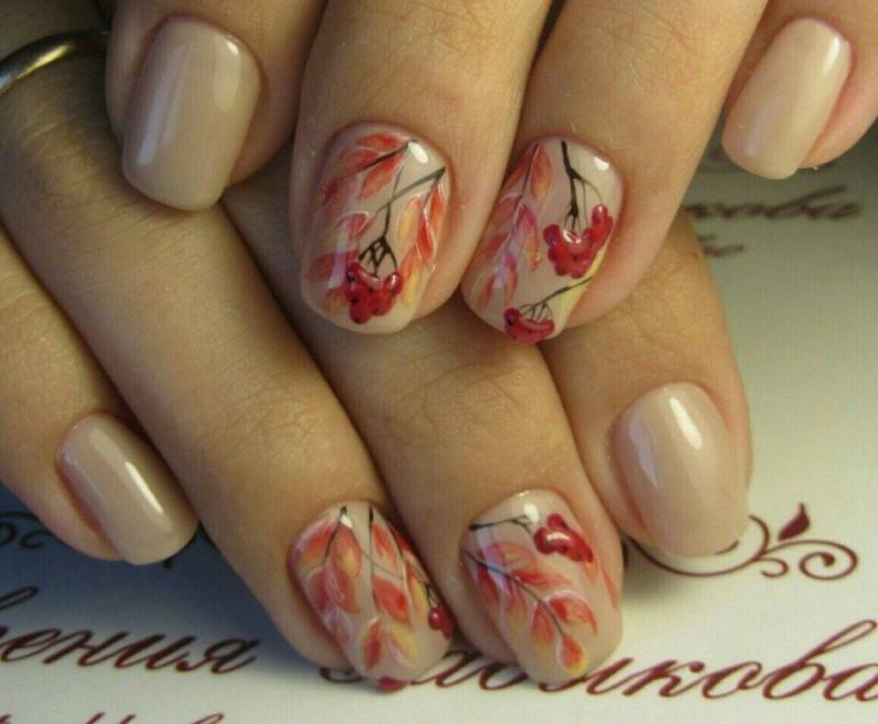 Нежные, лаконичные рисунки – едва ли не лучшее решение для оформления маникюра в бежевом цвете. Он пришелся по вкусу модницам, поскольку отличается своей универсальностью. Тонкие веточки, бутоны цветов и листики чаще всего нейл-мастера наносят вручную. Это не слишком сложно и в процессе требуется тонкая кисть, несколько лаков.