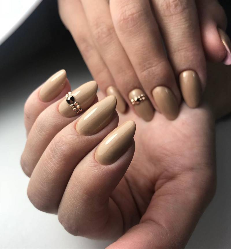 Длинные ногти дают большее пространство для фантазии и оформления ногтя. Но стоит помнить, что в тренде аккуратные ноготки практичной длины, а наращивание «по максимуму» давно не актуальны. Также на длинных ногтях стилисты не рекомендуют делать острую форму и квадрат. Для длины ногтя от 3 мм запросто можно использовать и глянцевое, и матовое бежевое покрытие. Ограничений по дизайну и декору нет.