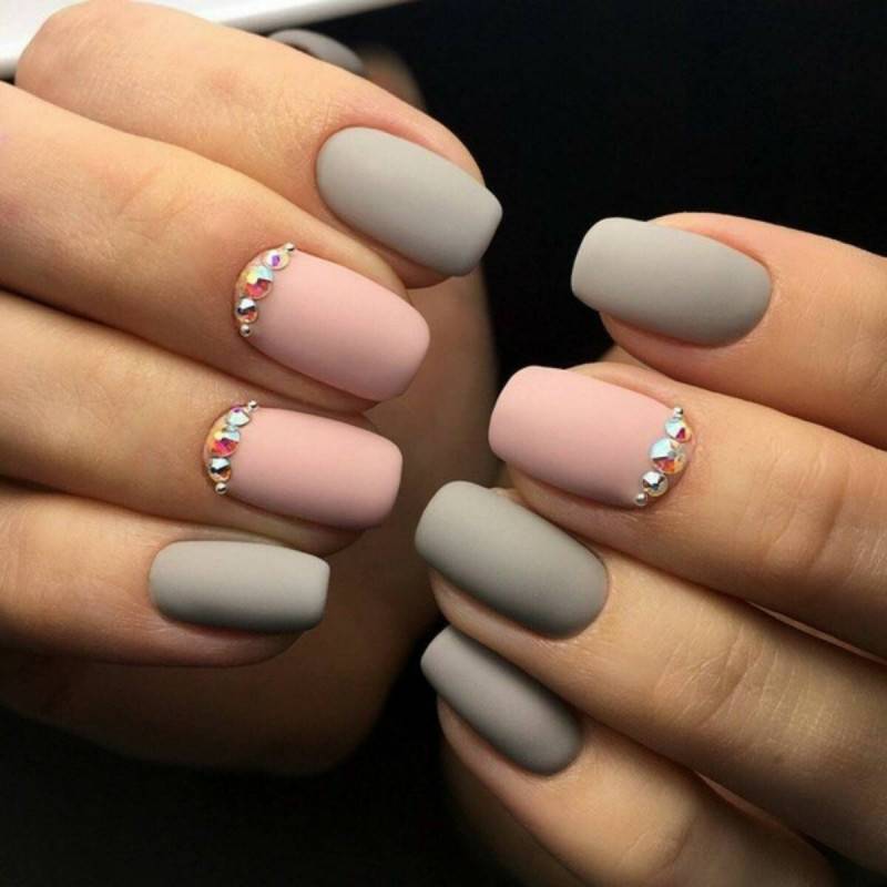 Пастельный маникюр на коротких ногтях в сером цвете позволит подчеркнуть индивидуальность стиля. В этом сезоне стилисты предлагают использовать матовое покрытие. Оно смотрится эффектно, необычно и элегантно. Если вы собрались на светский раут, добавьте к такому покрытию немного блеска и вы получите роскошный дизайн, который подойдет к любому вечернему наряду.