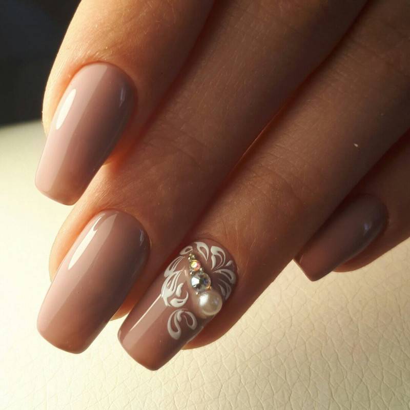 Светло-бежевый маникюр превосходно смотрится на длинных ногтях, создавая образ элегантной и деловой женщины. Для таких ногтей подойдут абсолютно все стразы светлого оттенка любых формы и размера.