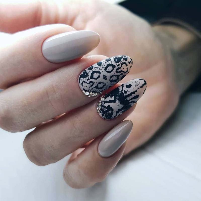 Нежный бежевый оттенок принято сочетать со строгим черным цветом. Такой макияж получается невероятно эффектным и элегантным. Нейл-дизайнеры предлагают сразу несколько способов сочетания этих цветов: