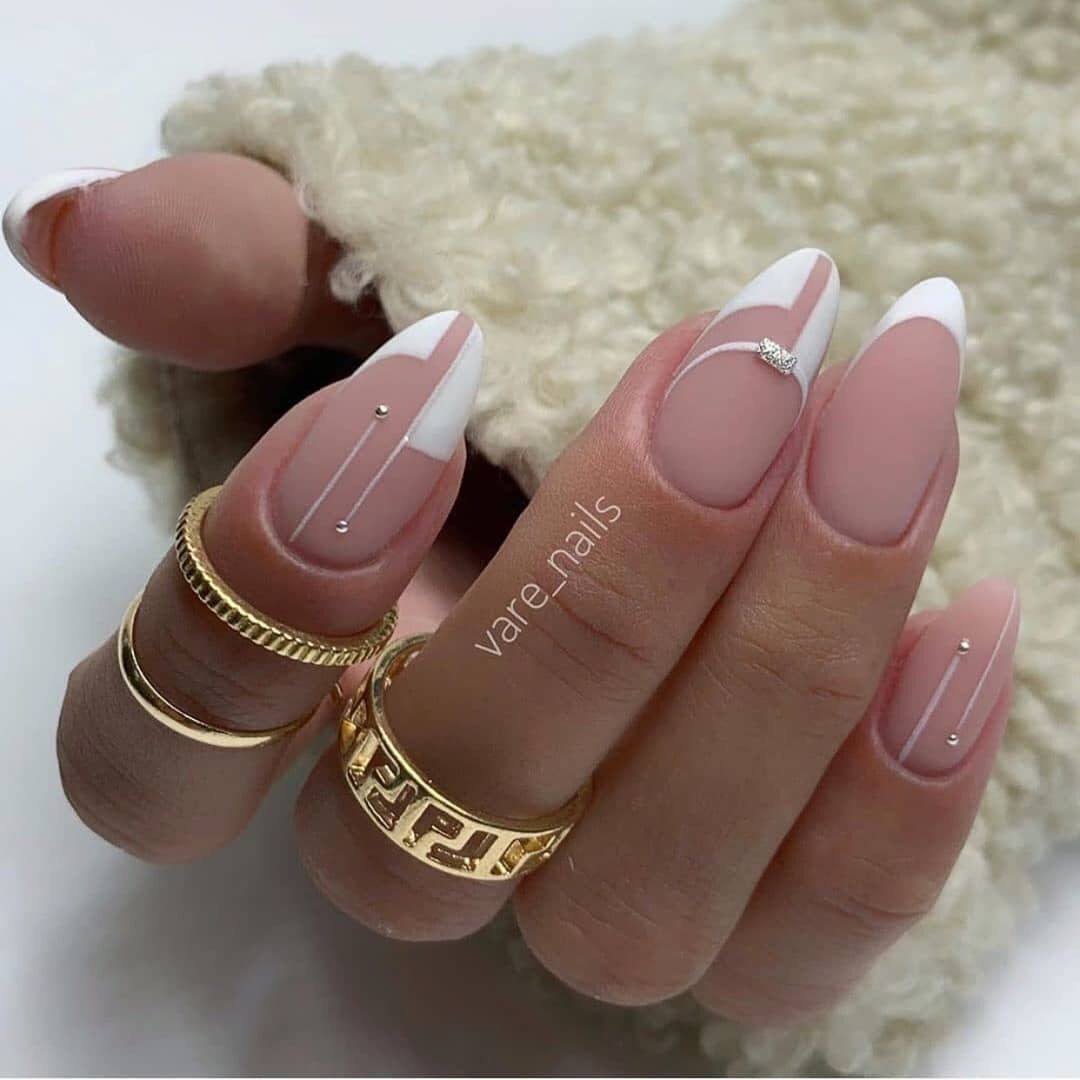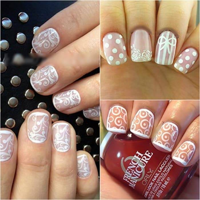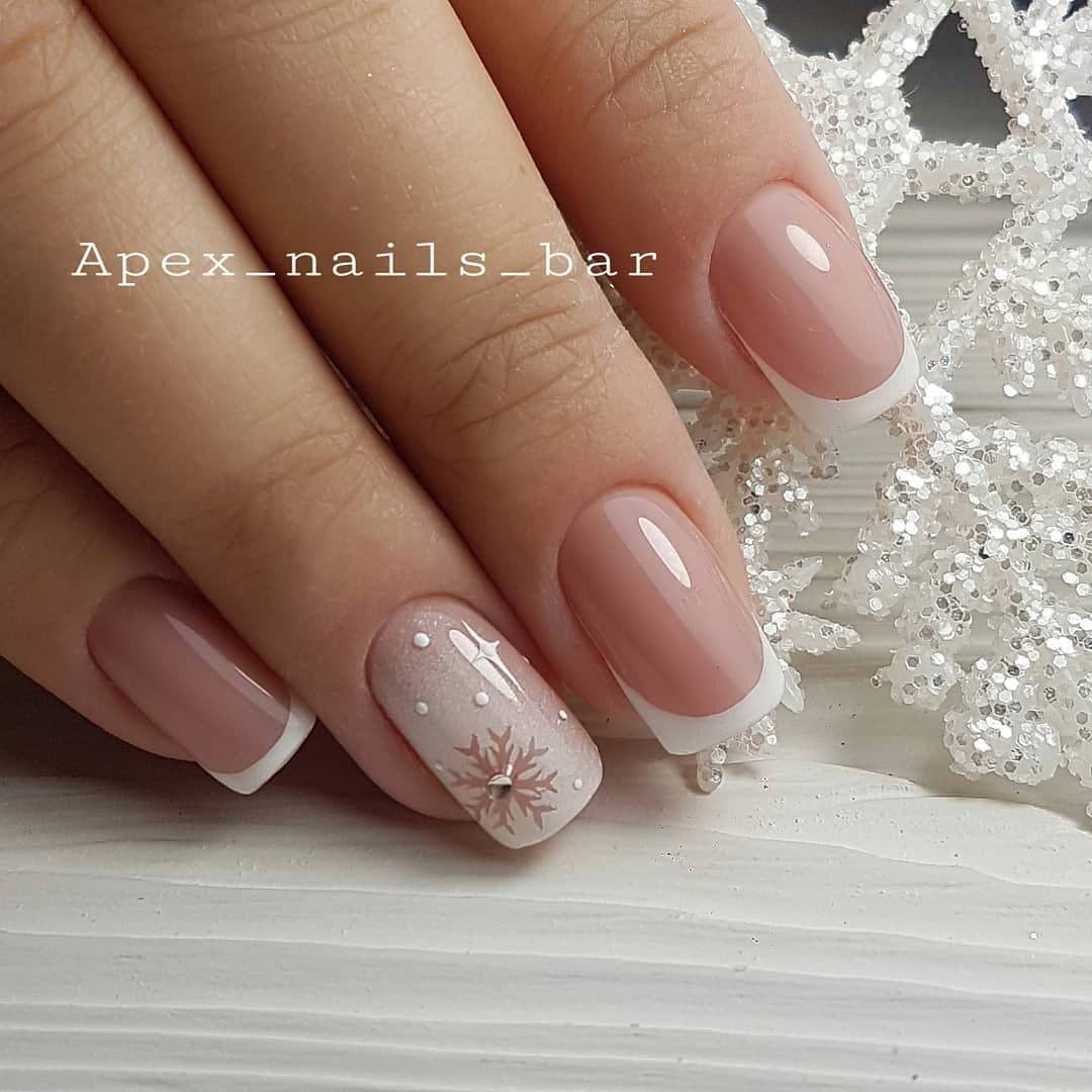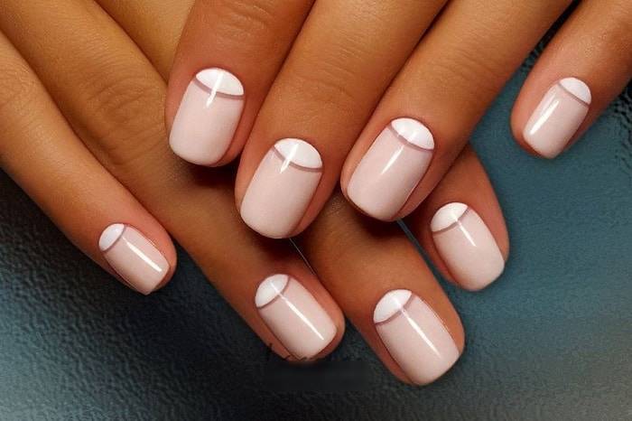 Невероятно нежный и неброский маникюр получится, если окрасить кончик ногтя в бежевый цвет, основная часть ногтевой пластины при этом покрывается прозрачным лаком. Для придания маникюру «изюминки», допускается использование блесток, страз в качестве декора. Также актуально дополнять такой маникюр яркими акцентами: рисунками, орнаментом, геометрией и пр. При желании можно делать и классический френч с использованием дополнительного цвета (молочный, слоновой кости, белый и т.д.).
