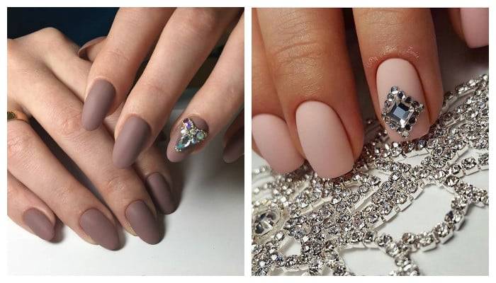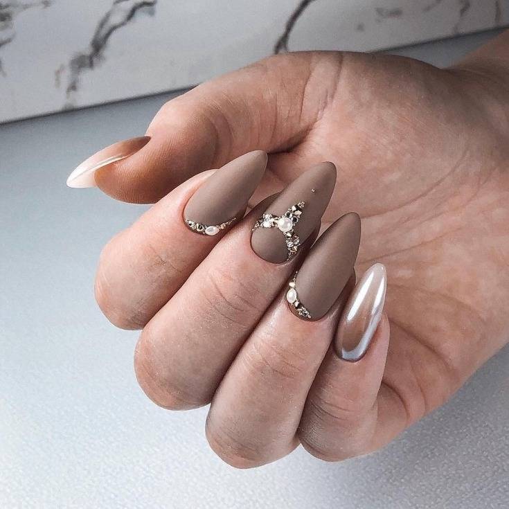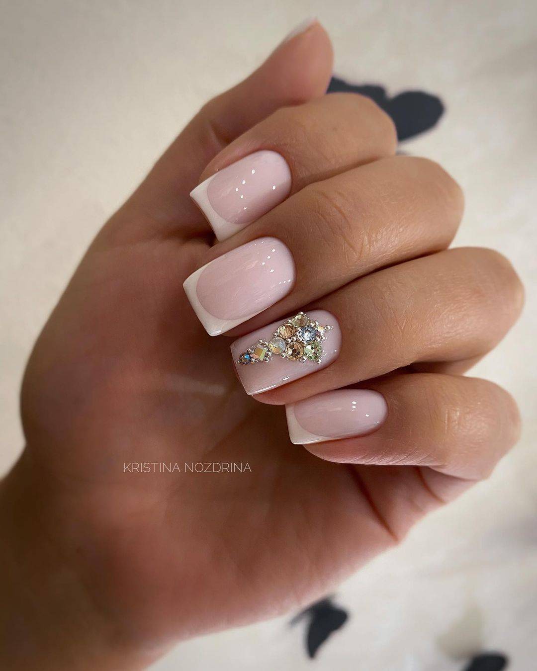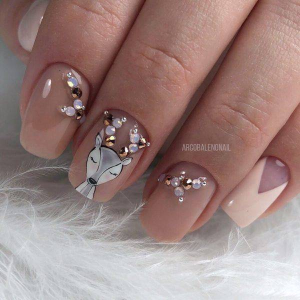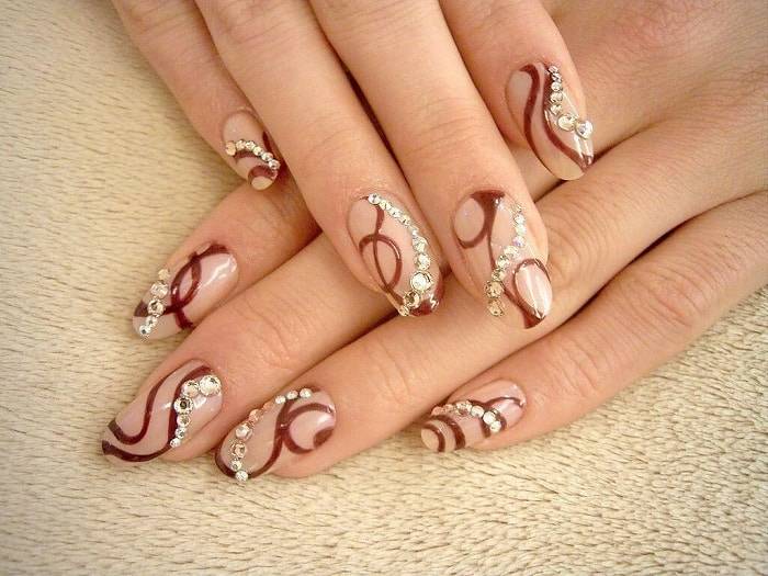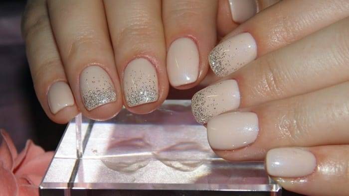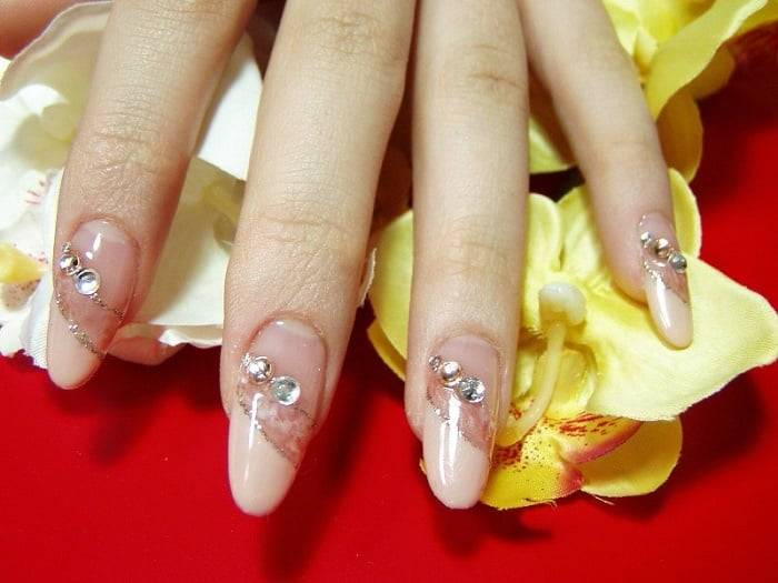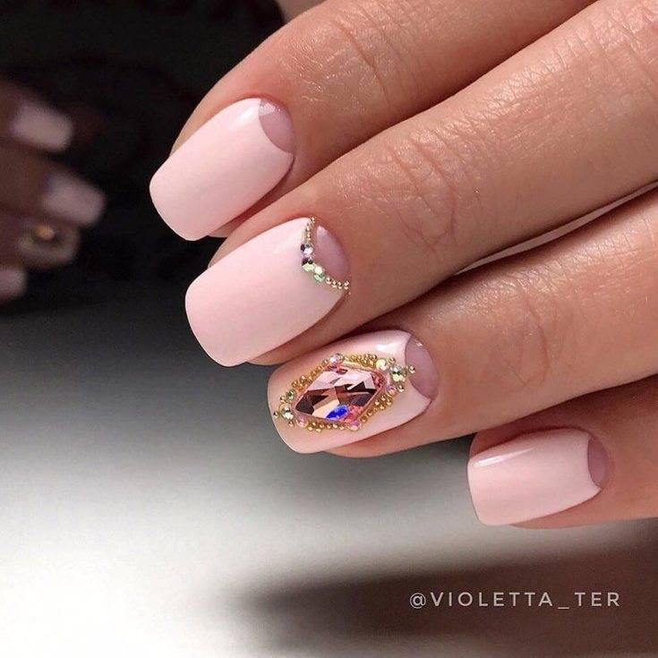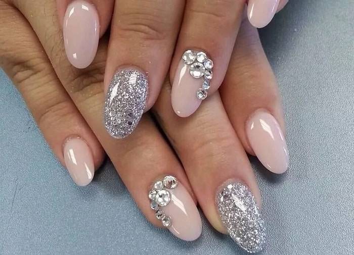 Стильные варианты оформления маникюра беж со стразами и блёстками