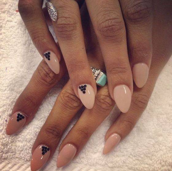 Каждый мастер индивидуально подбирает размер и расцветку камней в зависимости от основного оттенка гель-лака, длины ногтей и предпочтений самой модели. Какие бы камни, оттенки или декор вы ни выбрали, стоить помнить, что на острых ногтях нужно придерживаться стиля минимализм, чтобы не получить вульгарный и вызывающий дизайн.