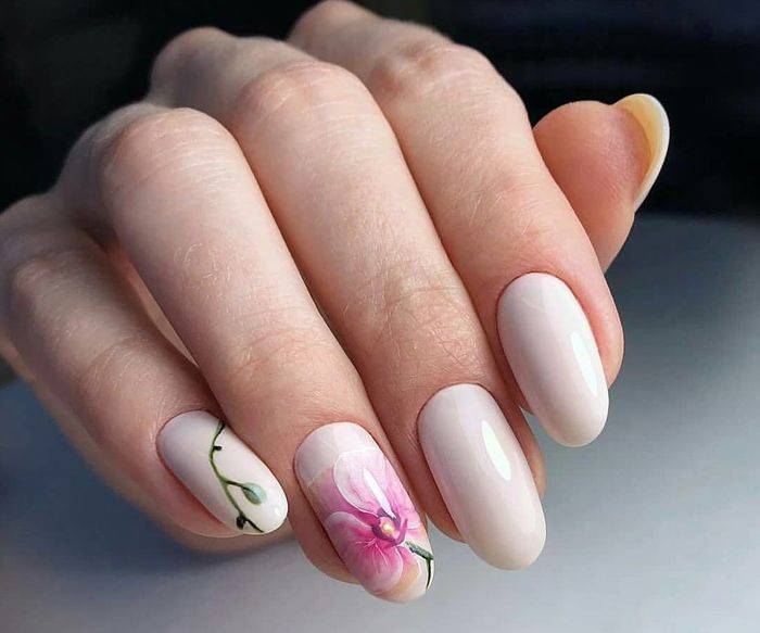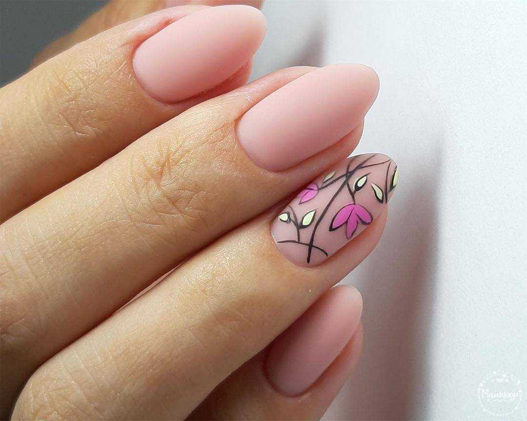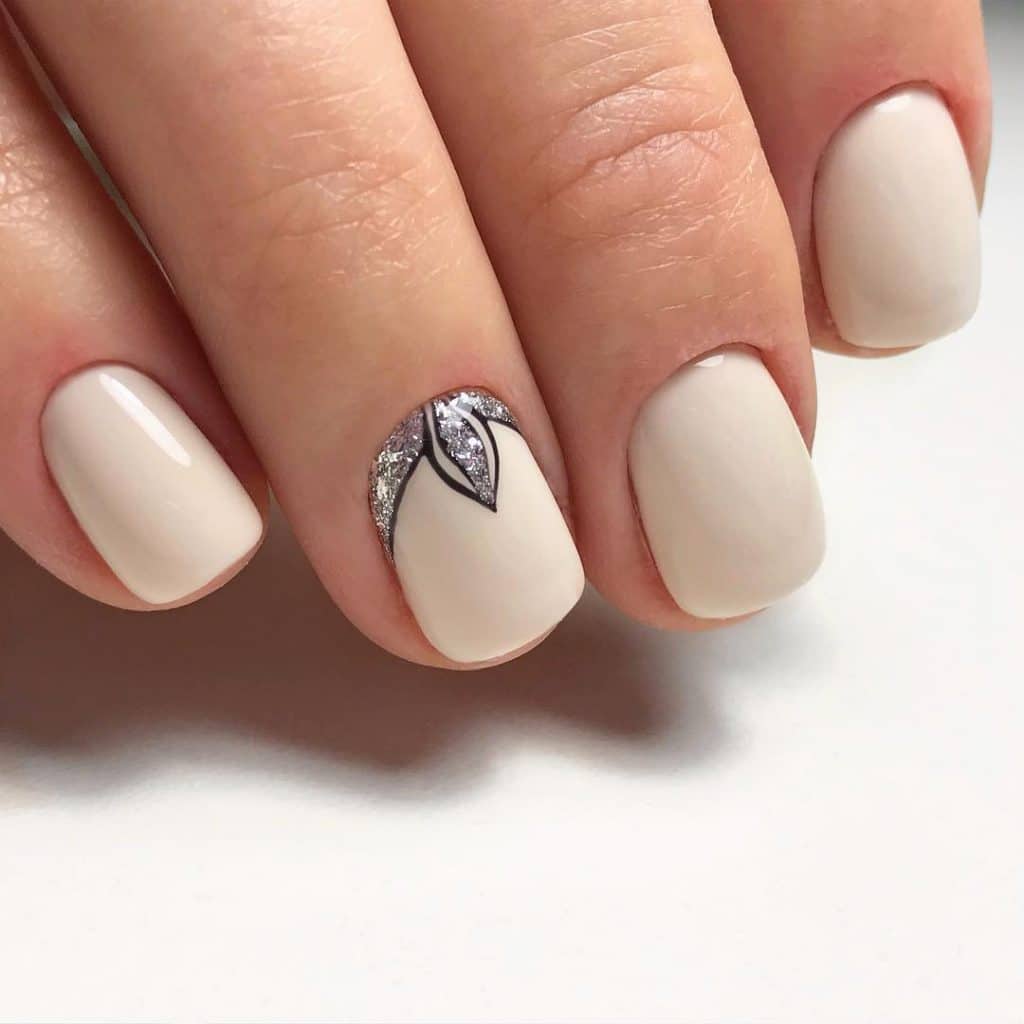 Нежные, лаконичные рисунки – едва ли не лучшее решение для оформления маникюра в бежевом цвете. Он пришелся по вкусу модницам, поскольку отличается своей универсальностью. Тонкие веточки, бутоны цветов и листики чаще всего нейл-мастера наносят вручную. Это не слишком сложно и в процессе требуется тонкая кисть, несколько лаков.