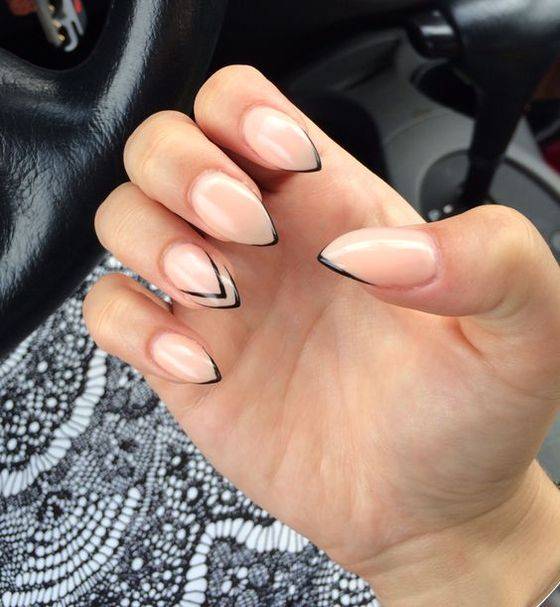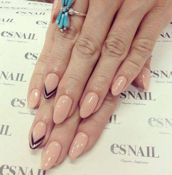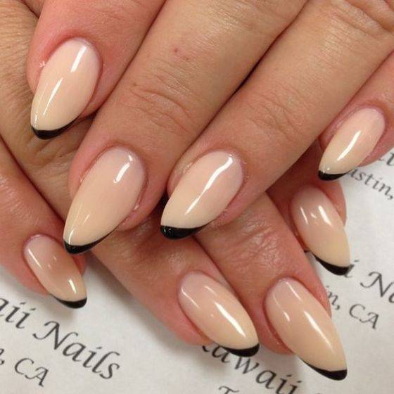 Ногтевая пластина полностью покрывается бежевым лаком, но верхняя полоска рисуется не классическим белым цветом, а черным. Такой дизайн смотрится очень оригинально.